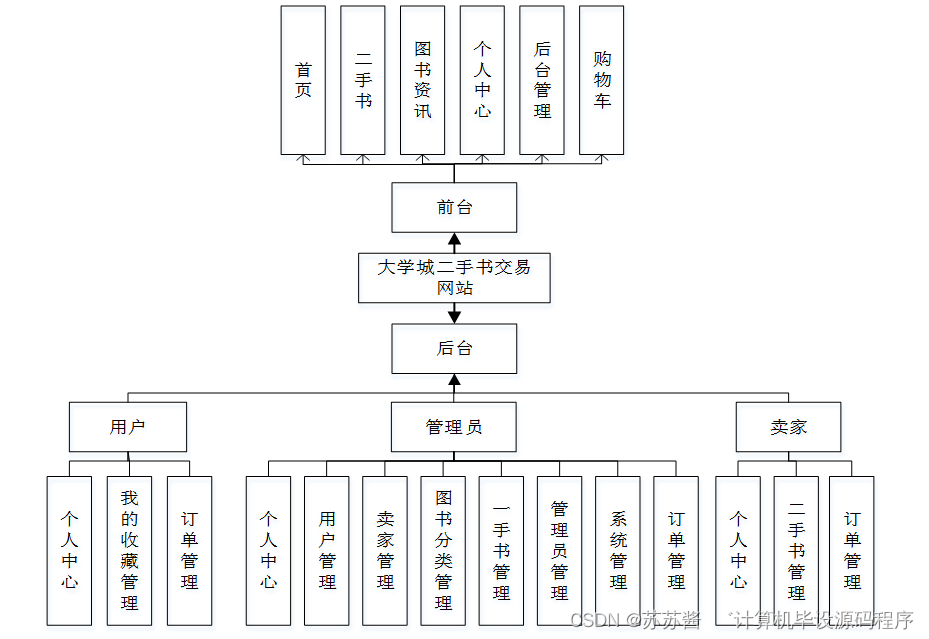 为了更好的去理清本系统整体思路,对该系统以结构图的形式表达出来,设计实现该大学城二手书交易网站的功能结构图如下所示: