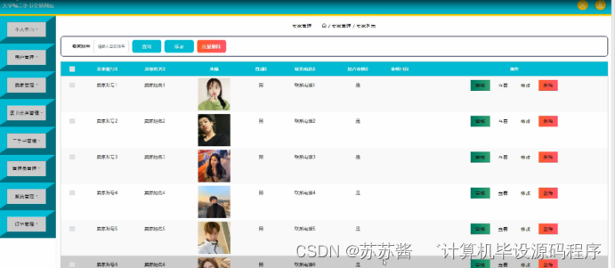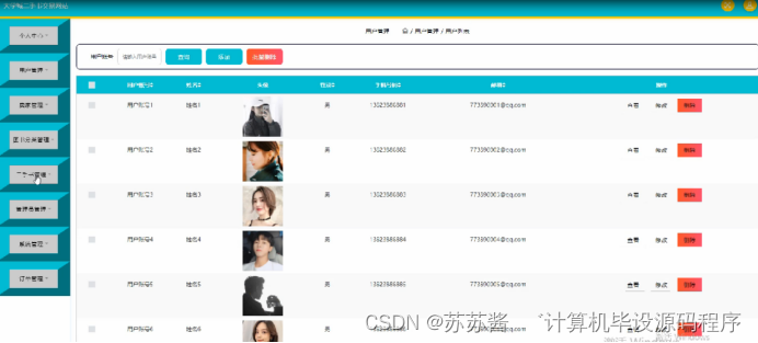 用户管理,在用户管理页面可以对用户账号,姓名,头像,性别,手机号码,邮箱等内容进行查看、修改或删除等操作,如图5-7所示。