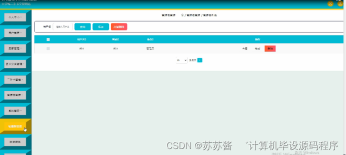 管理员登陆系统后,可以查看个人中心,用户管理,卖家管理,图书分类管理,一手书管理,管理员管理,系统管理,订单管理等功能,还能对每个功能逐一进行相应操作,如图5-6所示。