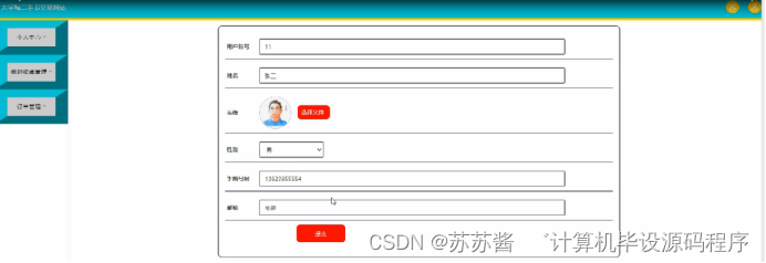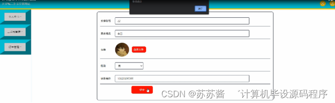 个人中心,在个人中心界面对用户账号,密码,姓名,图片,性别,电话,邮箱等进行修改操作,如图5-4所示。