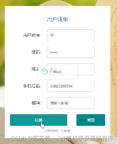 用户注册,在用户注册页面通过填写用户账号,密码,确认密码,用户姓名,用户电话,邮箱等信息进行注册操作,如图5-2所示。