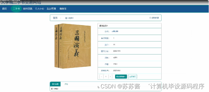 二手书,在二手书页面可以查看图书名称,价格,单次购买,库存,图书分类,成新,作者,卖家账号等内容,并可以进行点我收藏,添加到购物车,立即购买,评论等操作,如图5-3所示。