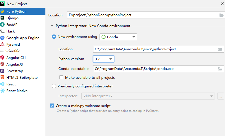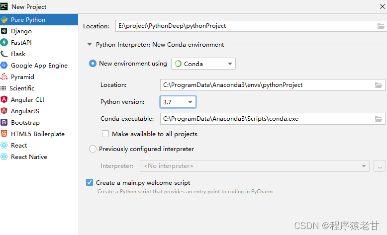 Location目录为你项目的地址。如果拟的anaconda配置成功,这里可以直接在New Conda Environment里的Location中配置拟的python虚拟环境路径以及选择对应的python版本。我一般会选择3.7版本。