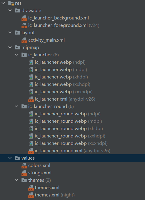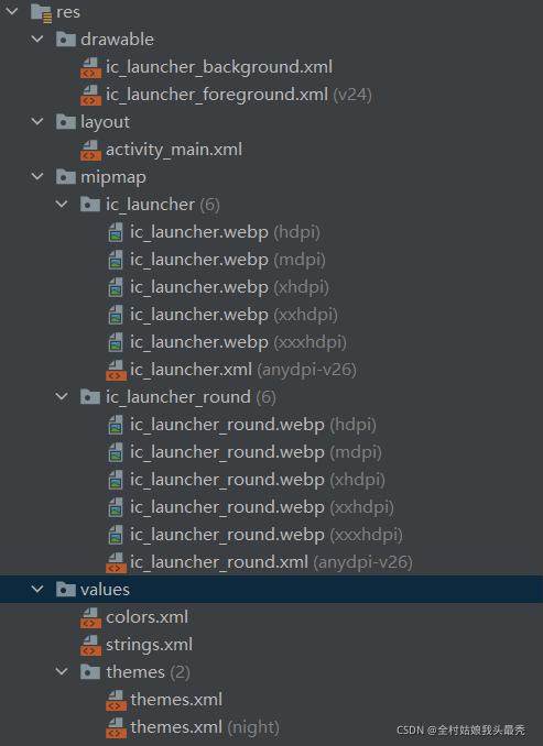 - drawable-v24:安卓新版本的图片目录,但不建议放在这个目录,因为老版本和一些机型会访问不到这一目录的资源
