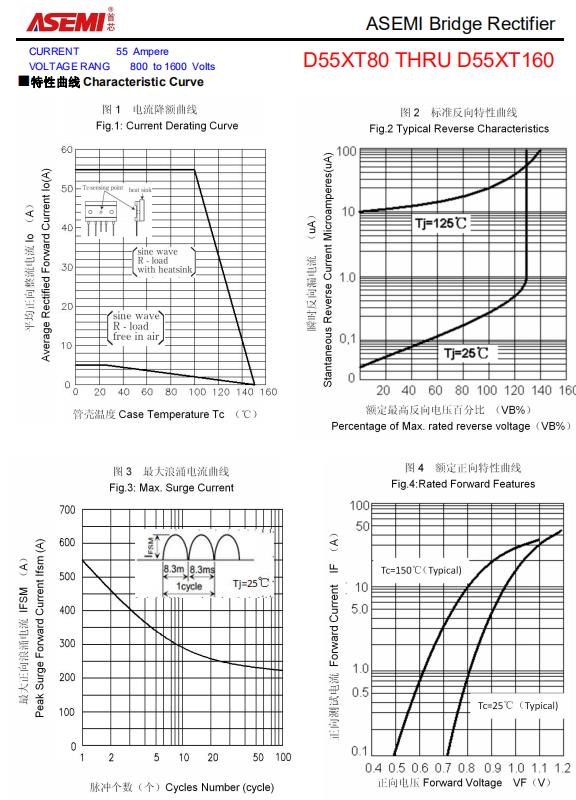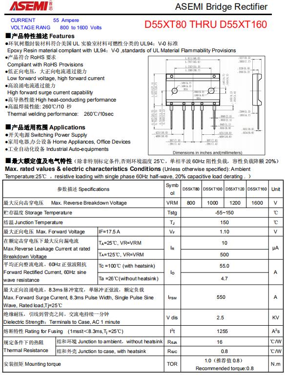 D55XT100的电性参数:最大正向平均电流55A;最大反向峰值电压1000V