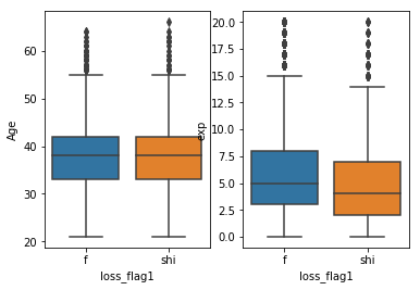 sns.boxplot(x = 'loss_flag1',y = 'exp',data = au, ax = ax2) #查看是否出险和年龄,驾龄的关系何须图
