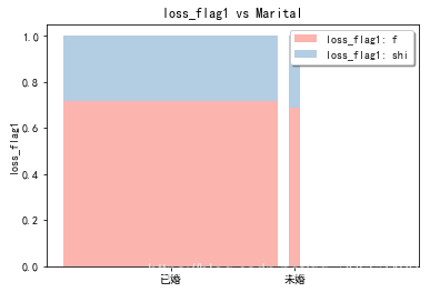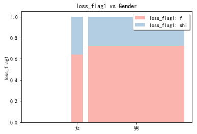 stack2dim(au,'Gender','loss_flag1') #调用以前写的库,画出性别和出险的关系图(柱状图的粗细代表数量,纵坐标代表百分比)