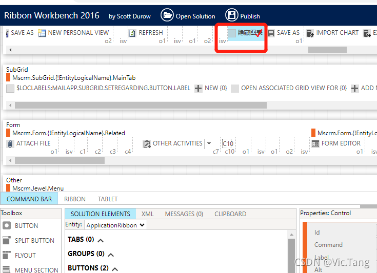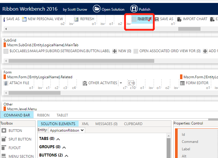 有的客户会要求系统上线前把不需要的按钮全部隐藏,因为他们不想用户去随便乱点,比如停用和禁用按钮,如果功能上没用到就需要隐藏,这两个是能通过Ribbon工具操作的,但有些按钮是无法用Ribbon来实现的。比如这里提到的显示图表和打开仪表板的按钮。
