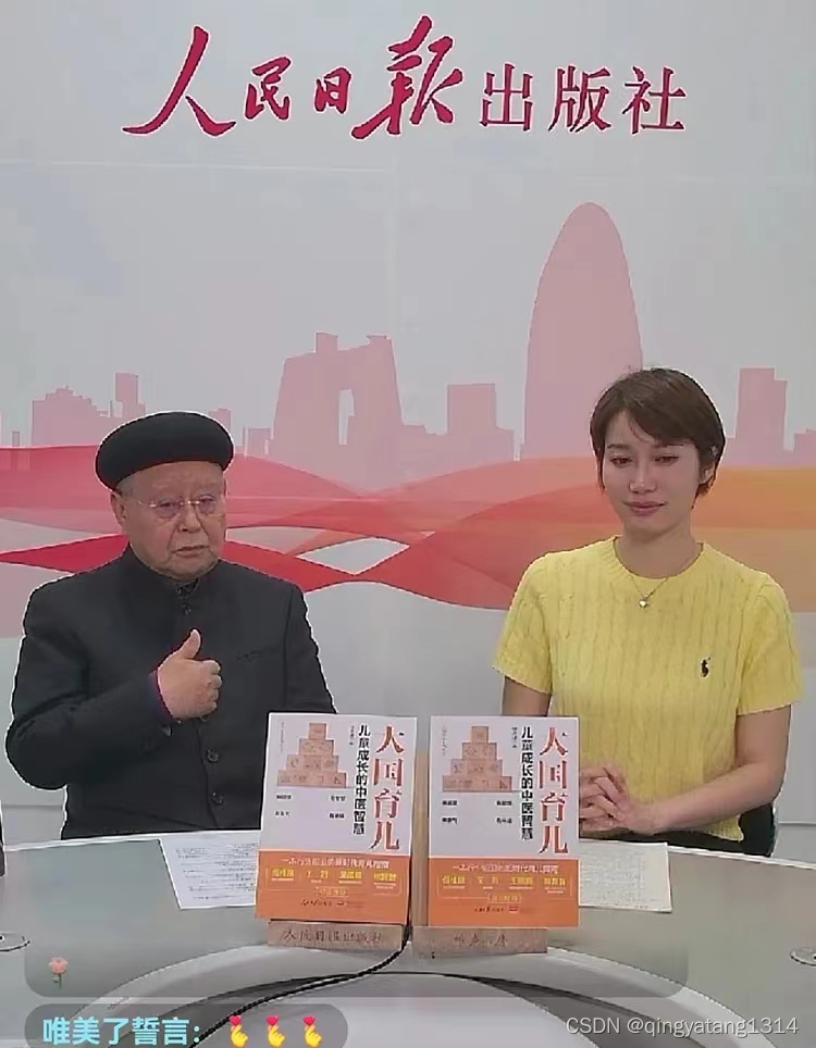 在直播活动现场人民日报出版社主持人和徐荣谦教授一起进行《大国育儿——儿童成长的中医智慧》的上架和开售。我们真切希望通过这本书,会有更多家长了解儿童养育的正确方法,社会上会出现更多“四有儿童”去成为家庭、民族和国家的脊梁。