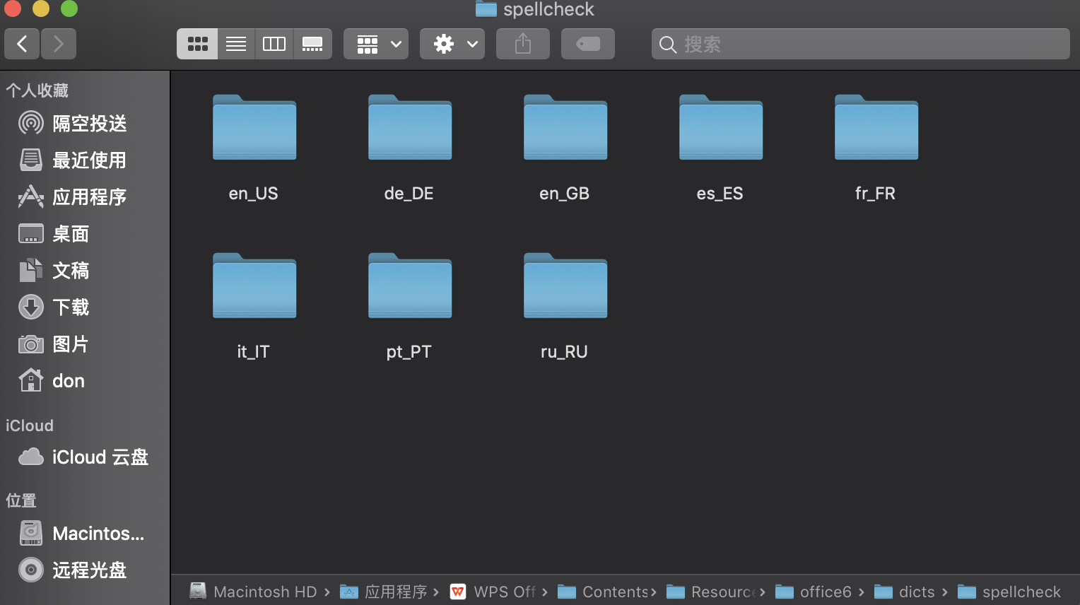 最后将下载好的字典包(例如上图中的 en_US就代表美式英语;ru_RU就代表俄语)复制粘贴到 这个“spellcheck” 文件夹中即可