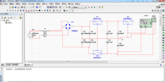 里面每一个电容值得确定也是有意义的,而且为什么只选择一个整流桥而不是两个也是有原因的。因为multisum库里面没有7906,所以暂时7905代替仿真。当真正自己要去做实物的时候就会发现需要考虑很多很多的东西,及电容而言,不光是电容值的确定,还有是电解电容还是瓷片电容等等,电容的值是查了许多资料的,第一个和第四个电容是起滤波作用,第二个和第三个是防止自激振荡的,第四个一定要比第一个的电容值要小,第二个和第三个电容在实际焊的时候一个要和三端集成稳压芯片挨得很近。电解电容是有正负极的,正的接高电平,负的接低电平,我最开始接连爆了两个电解电容,都是3300uF的,电容爆炸的原因只会是过热,过压,后来检查发现是我电路有个地方焊错了,导致其过压,所以一接上去通电顶部就爆了电解质流了出来,而且我极性也接反了,幸亏我当初买的时候元件都是双倍买了,有多余的可以替换,后来这些问题解决之后,都可以非常稳定地输出电压了,误差在0.01V,很满意,还有注意一点就是变压器的地线要和板子的地线接在一起,不然一样得不到所要的输出,我最开始没接,所以输出很不正常都只有3V,接上之后,线路没接错的输出都非常稳定,把焊错的线路改过来之后,都可以OK地输出了。第一个电容太小会导致波纹不稳定的。学过滤波应该知道。