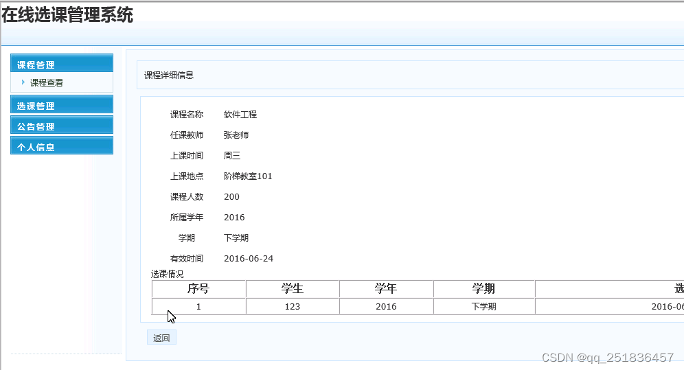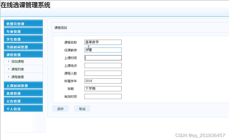 (5)课程管理:对课程信息进行添加、删除、修改和查看