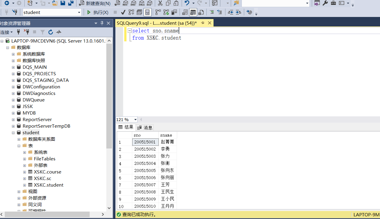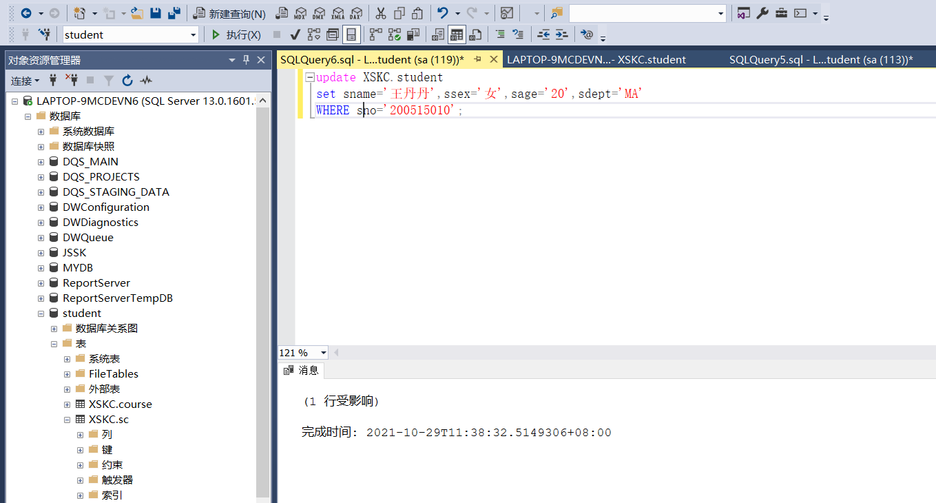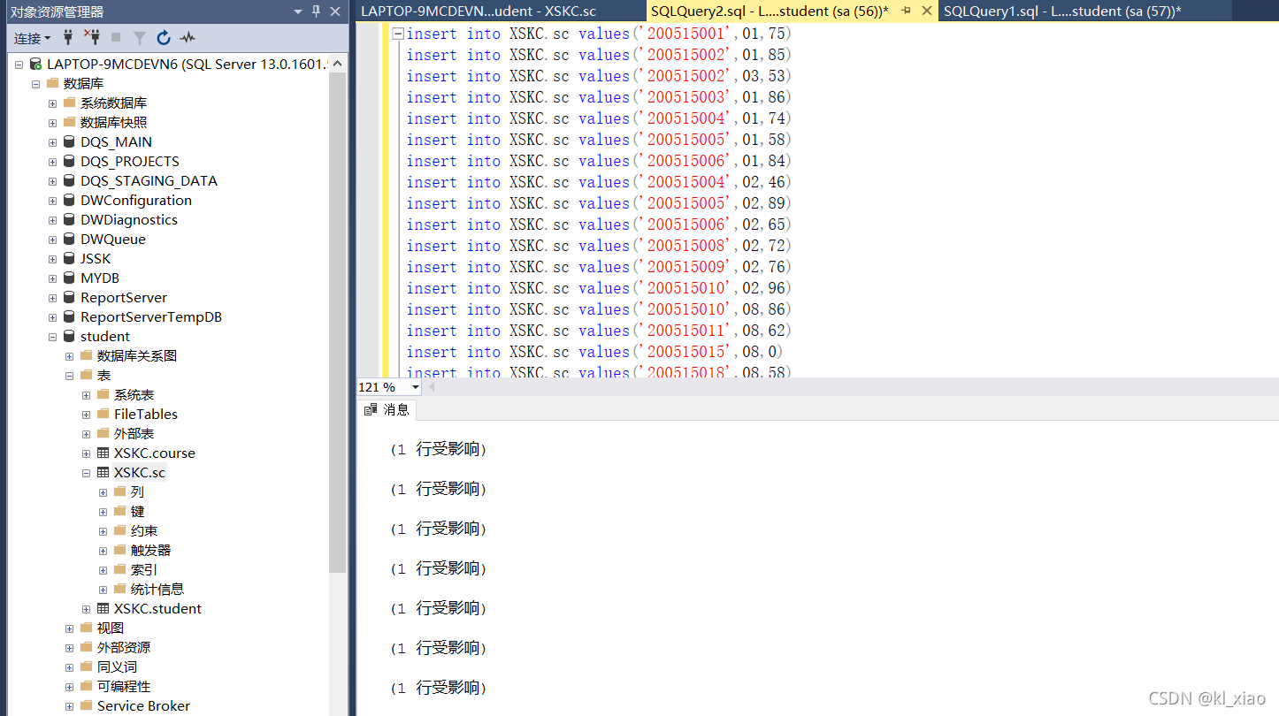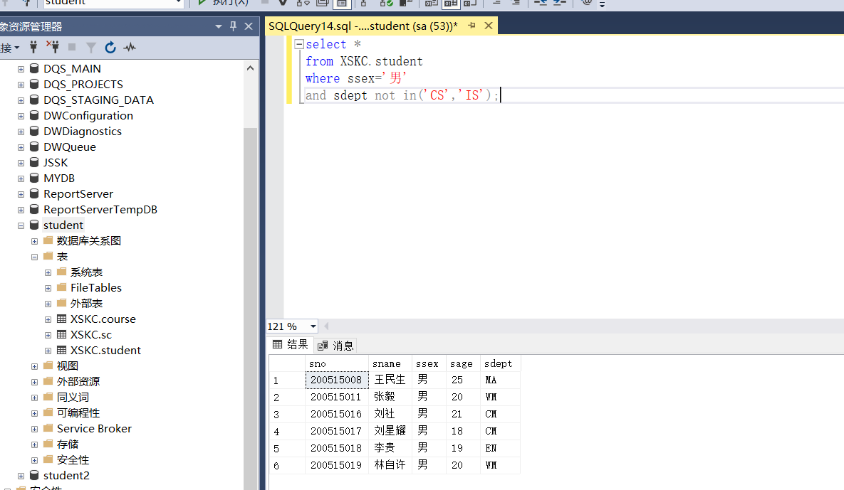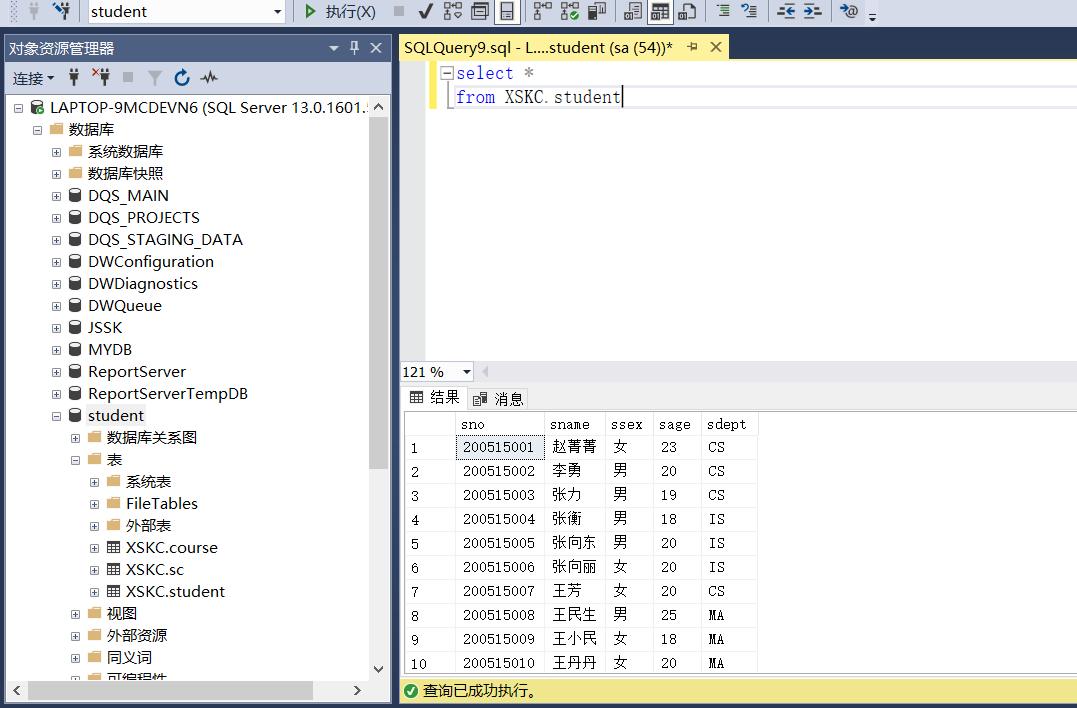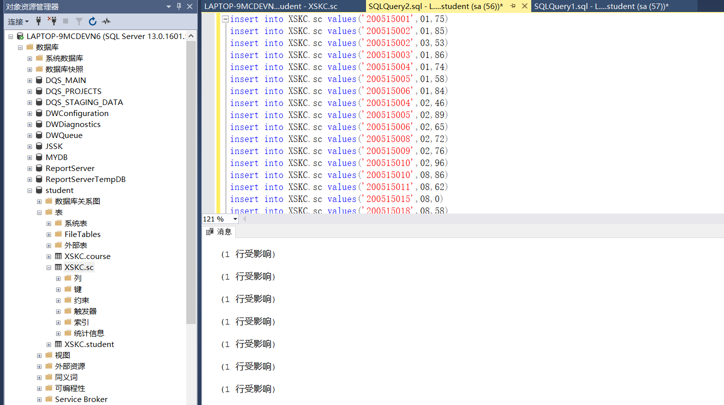 依据实验三建立的数据表结构(student、course、sc),分别使用Management Stuio界面方式及T-SQL 语句实现进行以下操作: