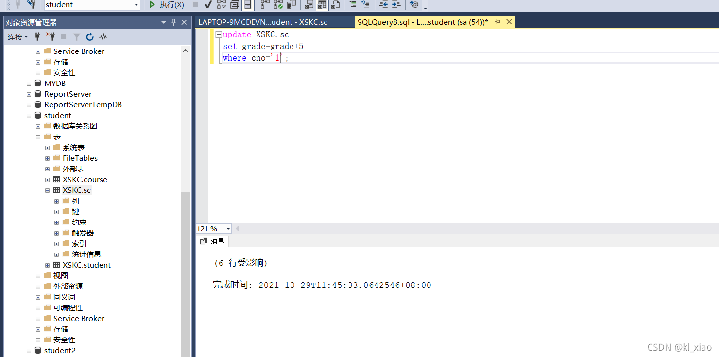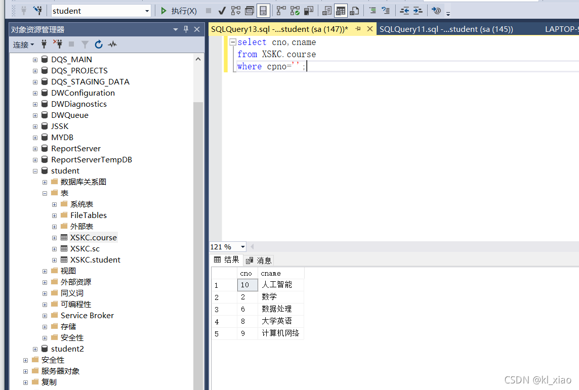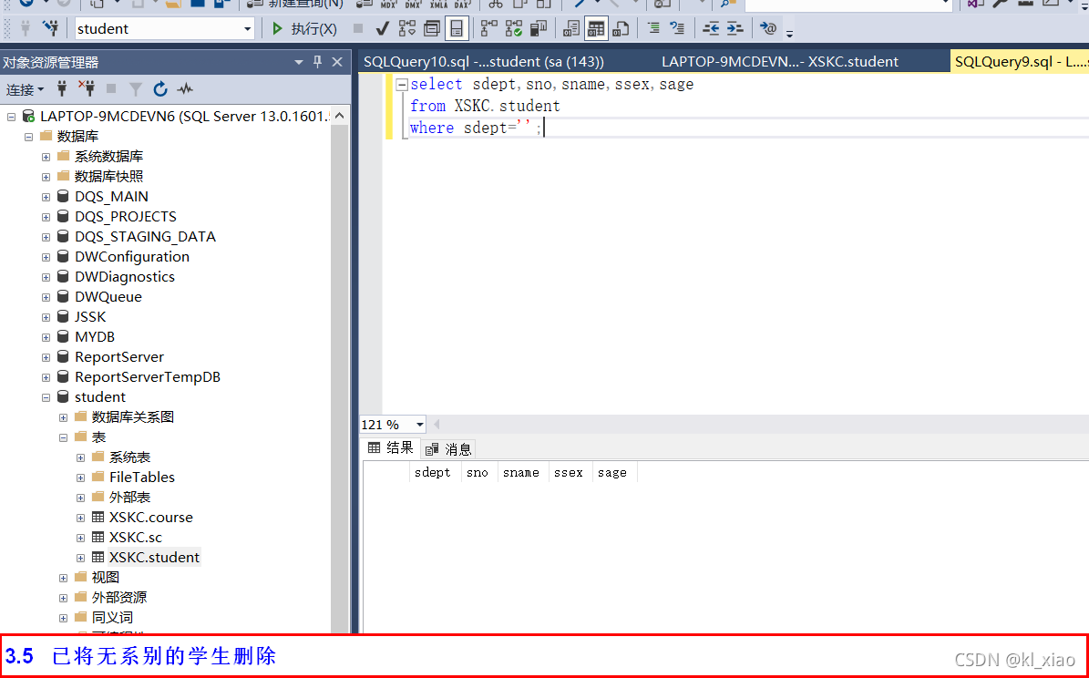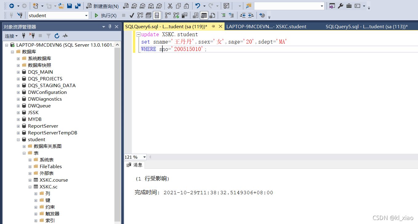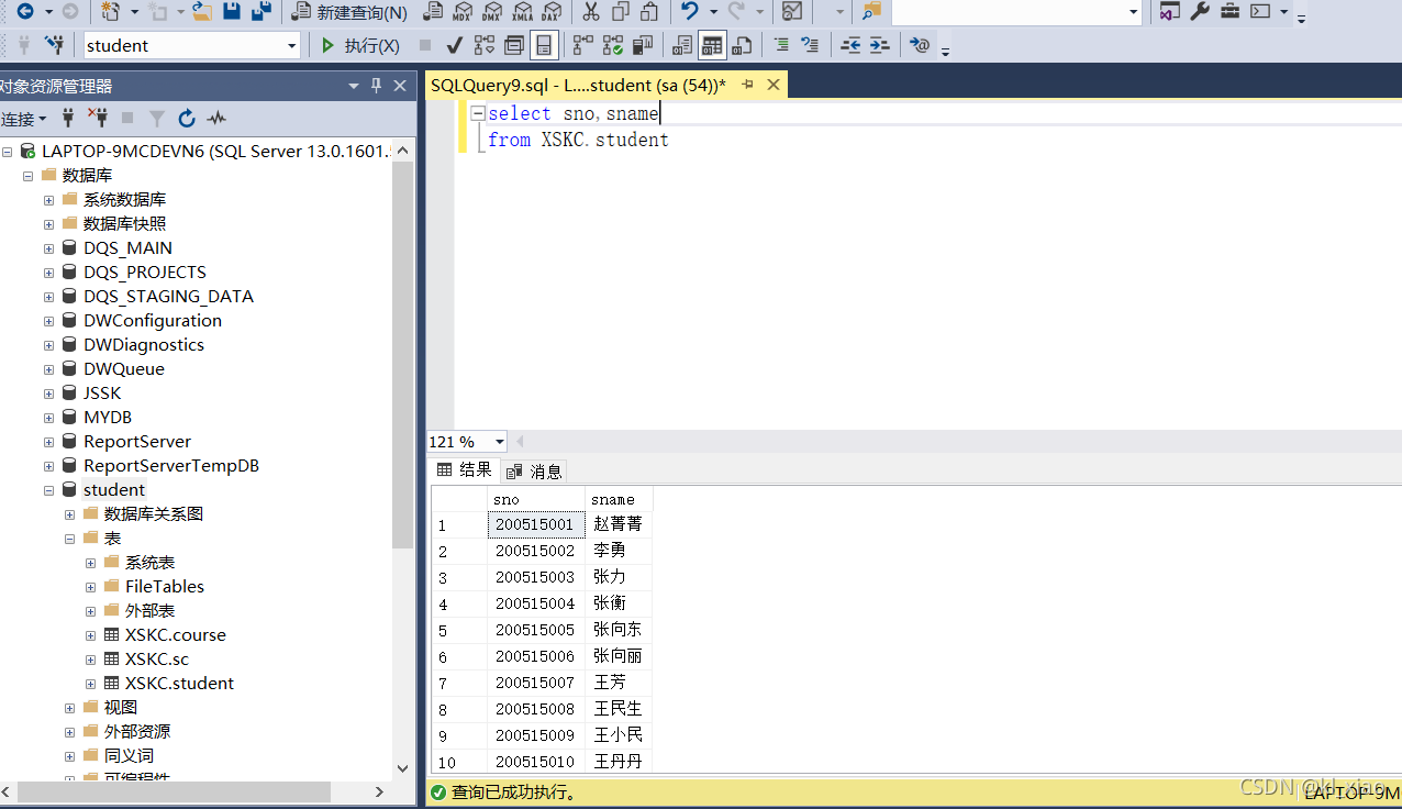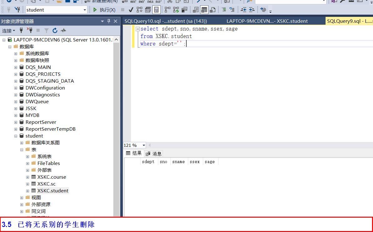 依据实验三建立的数据表结构(student、course、sc),分别使用Management Stuio界面方式及T-SQL 语句实现进行以下操作:
