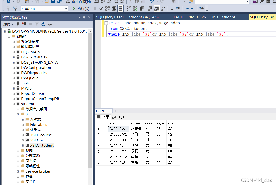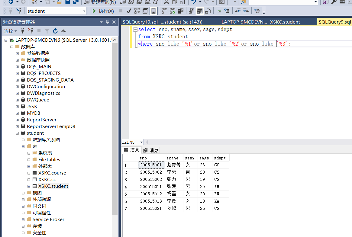 - 显示学号最后一位为1或者2或者3的学生的学号、姓名、性别年龄及院系;