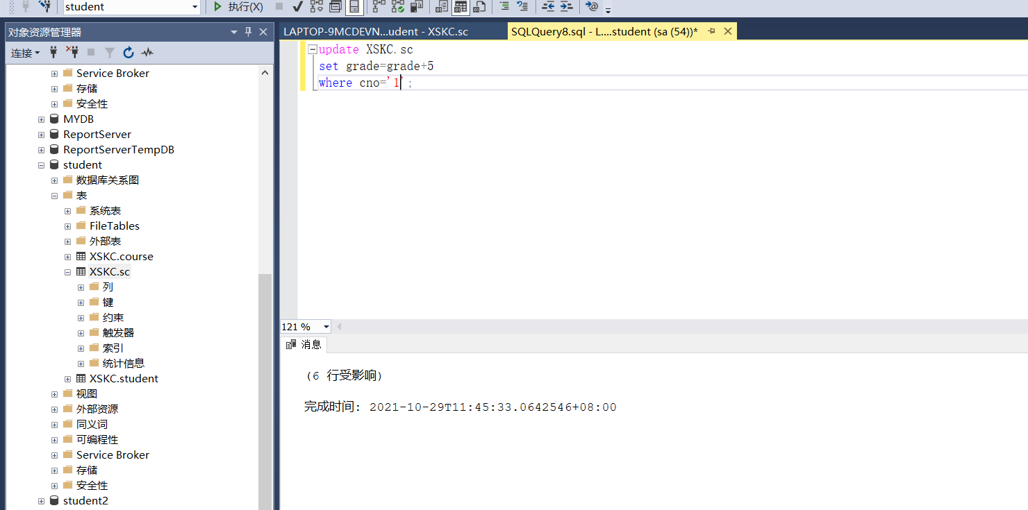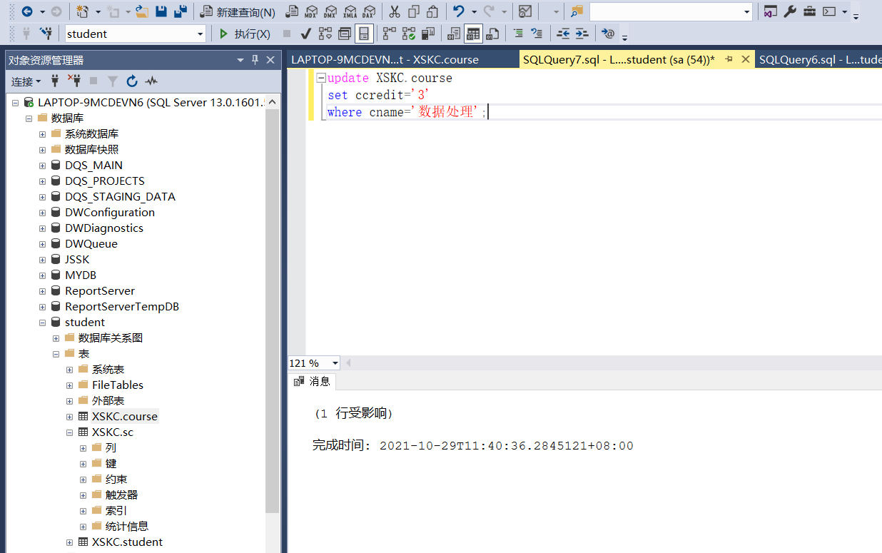- 修改course表,将“数据处理”的学分改为3学分;