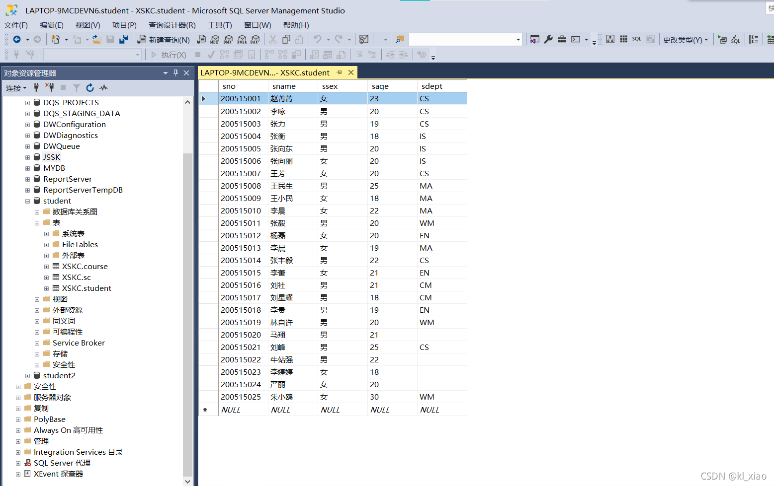1. 使用Management Stuio界面方式向student表中插入如下记录: