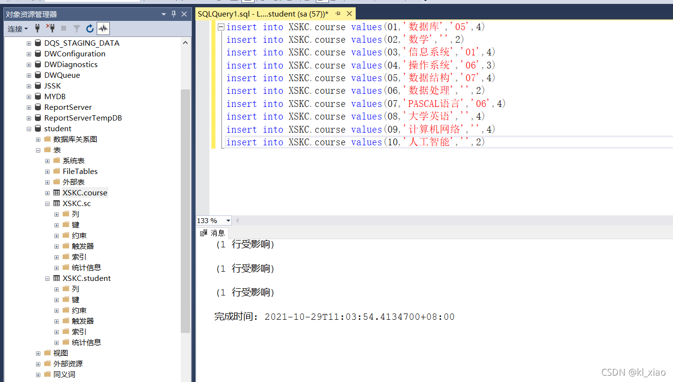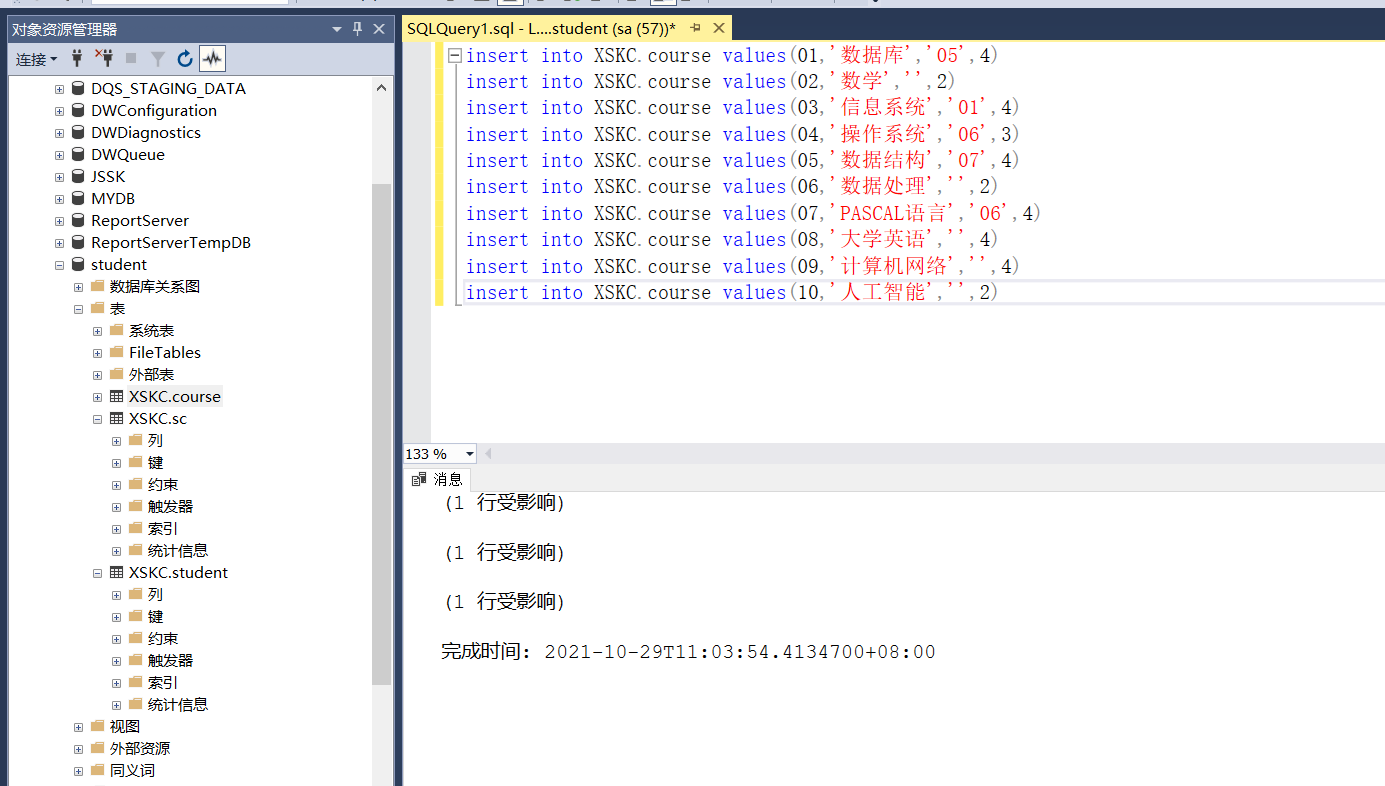 2.使用T-SQL 语句向course和SC表中插入如下记录: