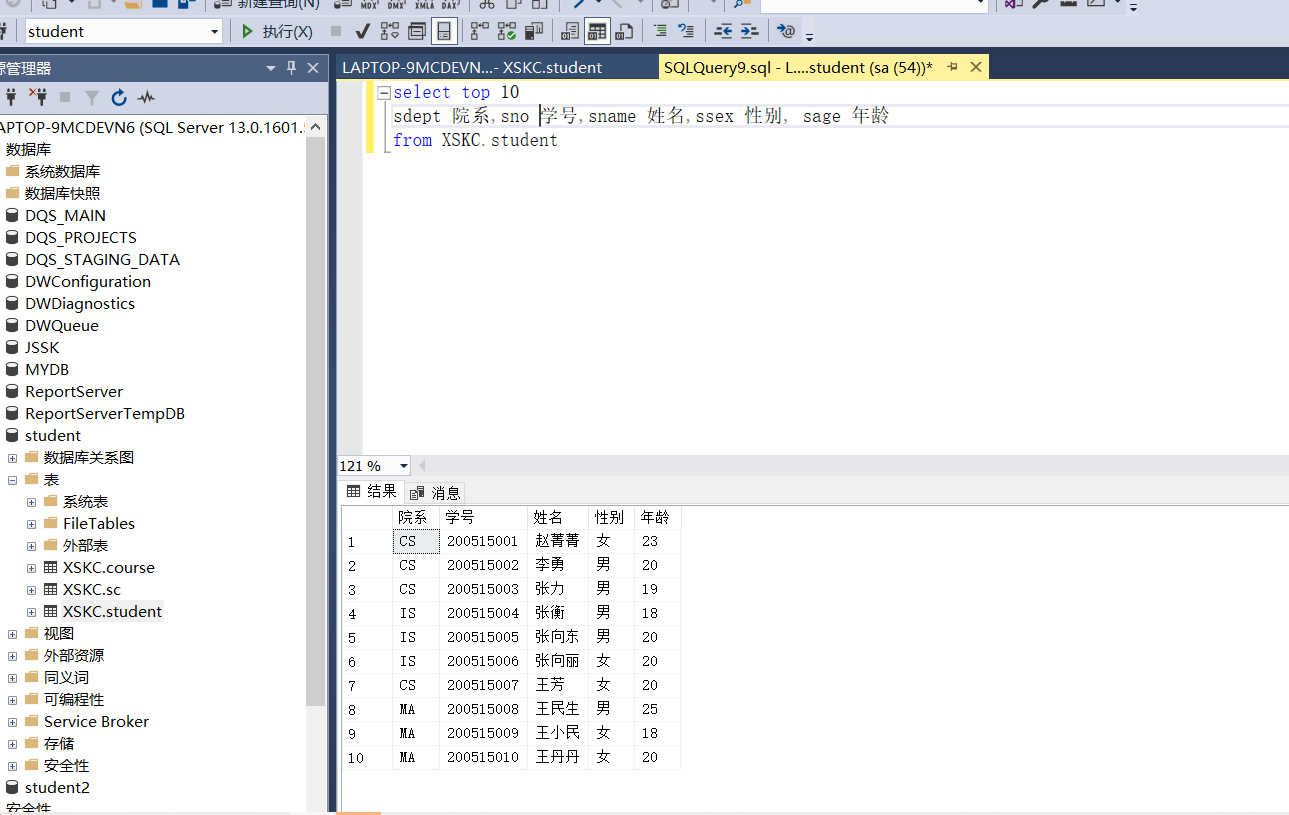 - 按照院系、学号、姓名、性别、年龄的顺序显示学生信息表中前10个同学记录,要求在结果集中列标题按照上述内容显示;