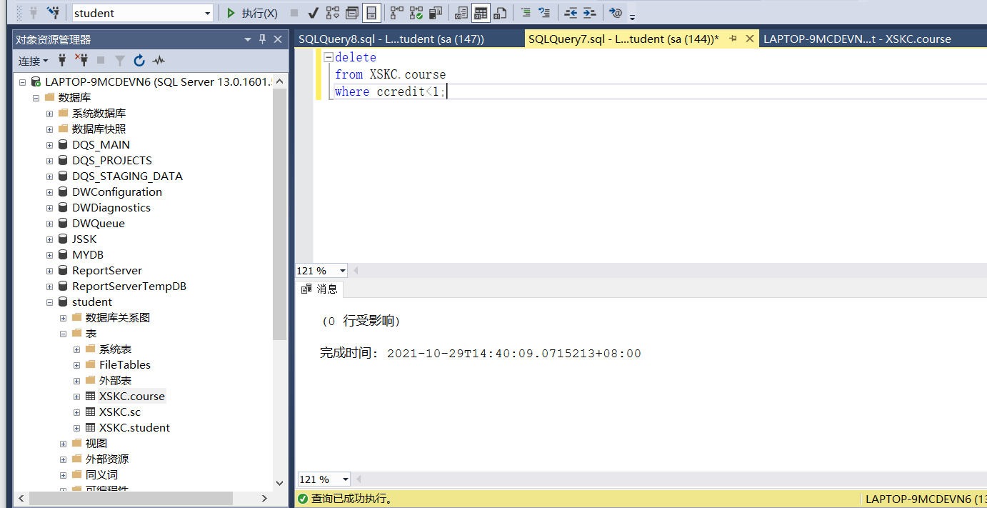 - 删除数据表course中学分低于1学分的课程信息;