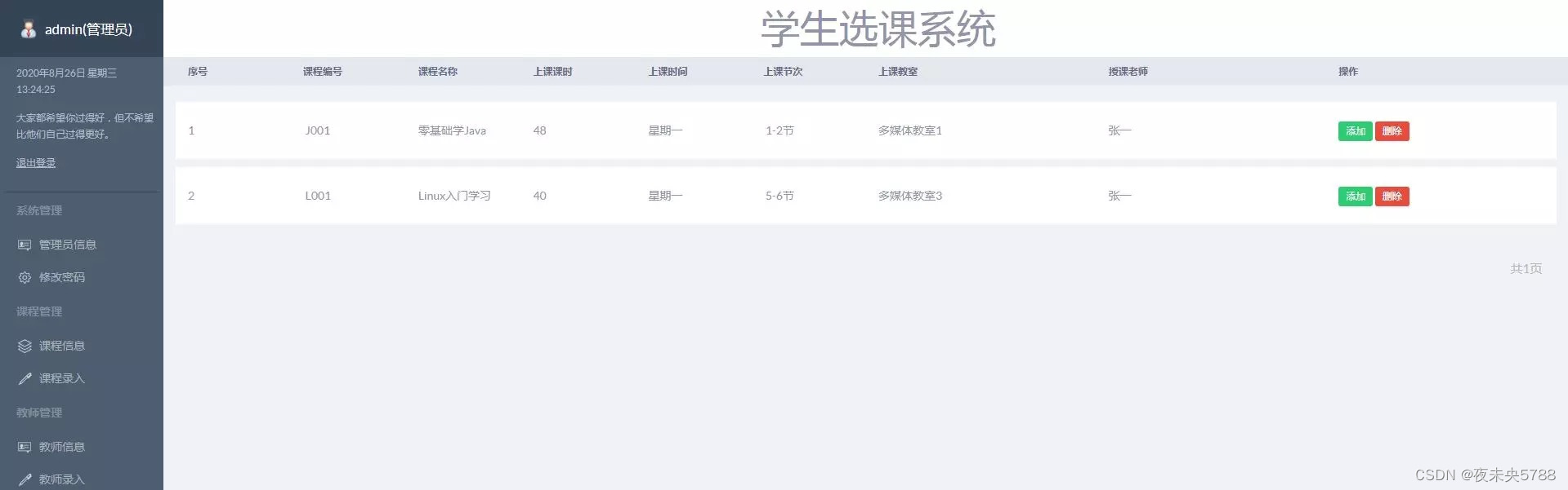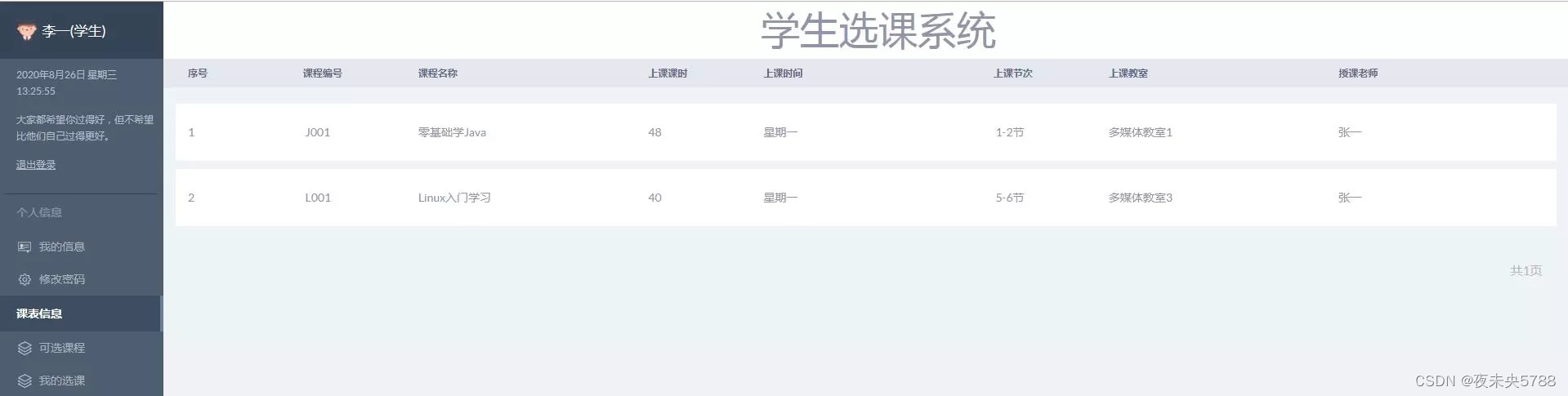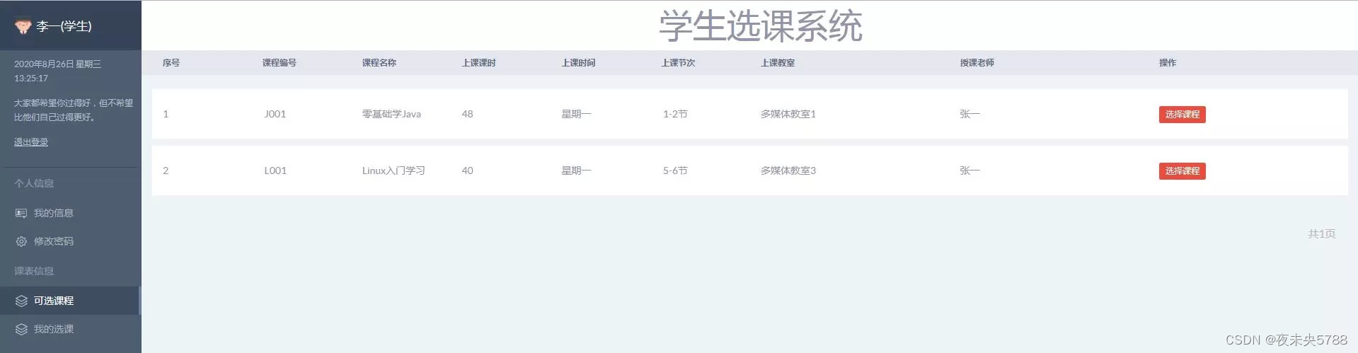一款简单的Servlet + mysql + jsp的选课系统,主要有三大模块,管理员模块,教师模块,学生模块。管理员模块主要功能模块有系统管理,课程管理,教师管理,课表管理,学生管理;教师模块和学生模块的主要功能模块有个人信息和课表信息的查询,其中学生包括选课的功能。