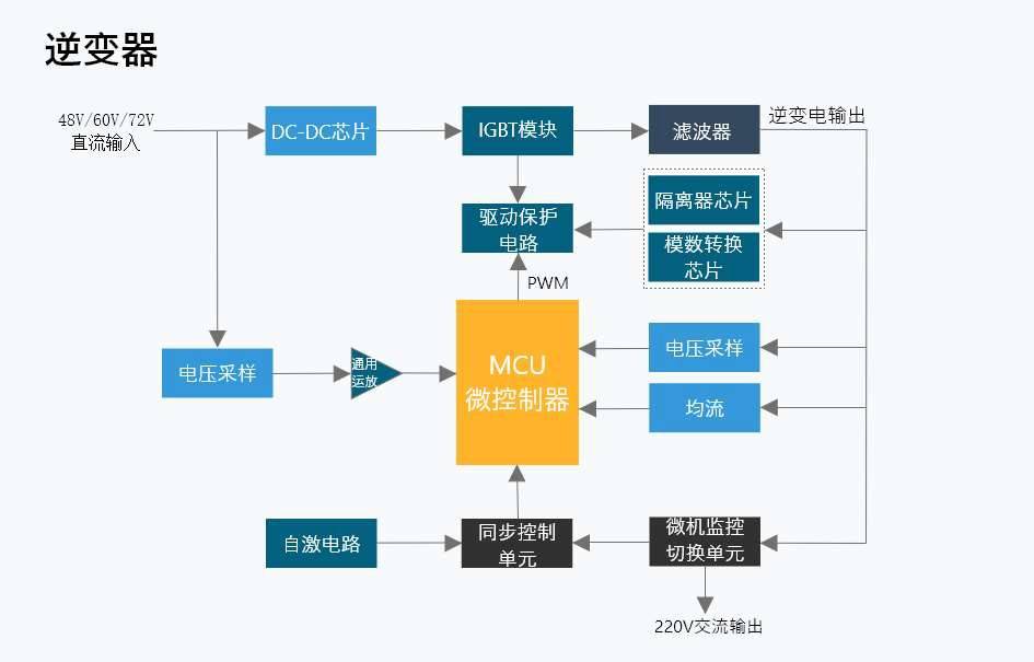 逆变器是把 直流电能(电池、蓄电瓶)转变成交流电( 一般为220 V, 50Hz 正弦波)。它由逆变桥、控制逻辑和滤波电路组成 , 主要包括输入接口、电压启动回路、 MOS开关管、PWM 控制器、直流变换回路、反馈回路、 LC振荡及输出回路、负载等部分 。控制电路控制整个系统的运行,逆变电路完成由直流电转换为交流电的功能,滤波电路用于滤除不需要的信 号。其中逆变电路的工作还可以细化为:振荡电路将直流电转换为交流电;线圈升压将不 规则交流电变为方波交流电 ; 整流使得交流电经由方波变为正弦波交流电。