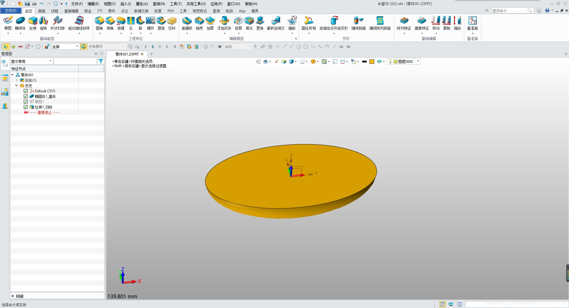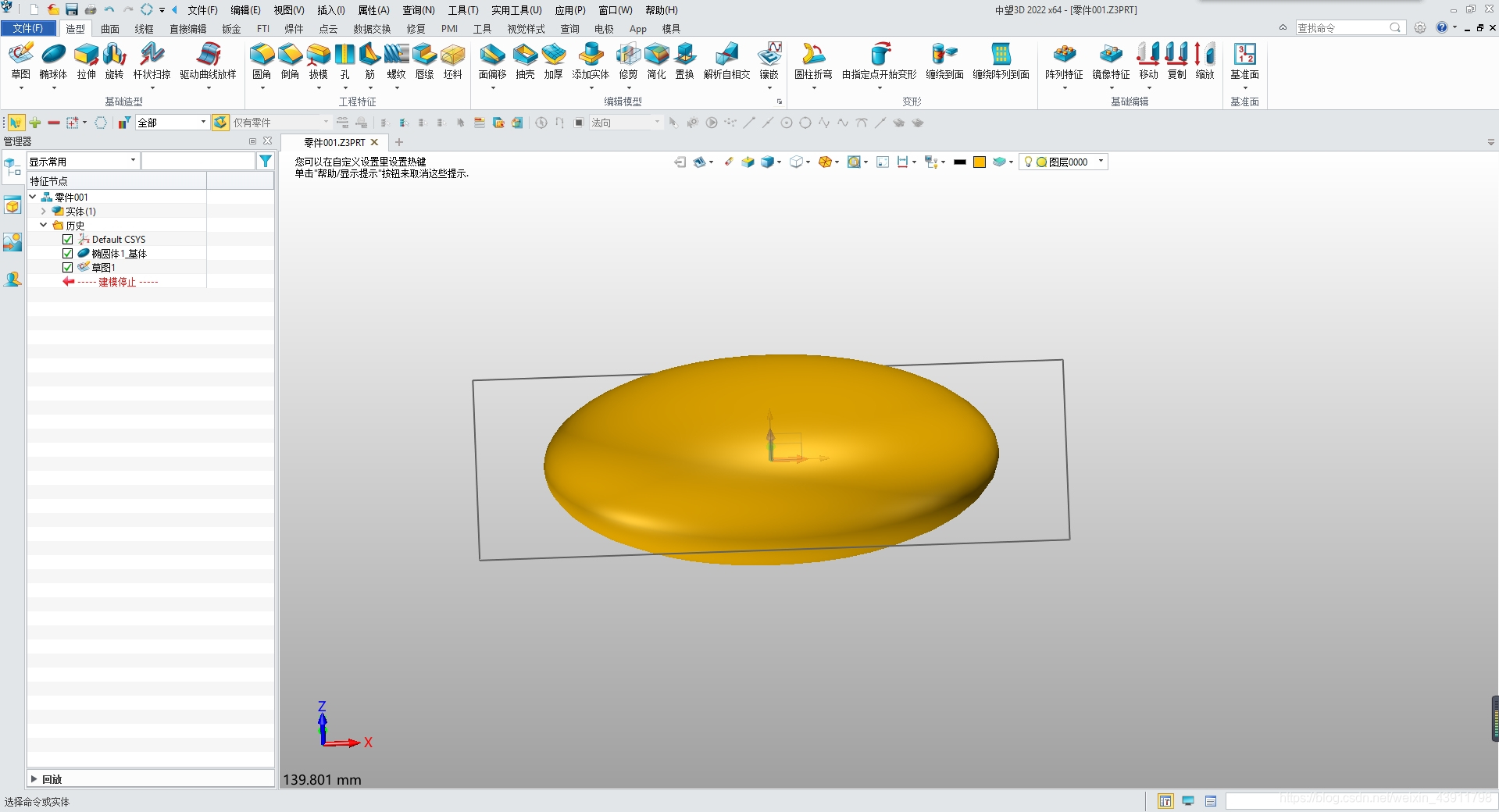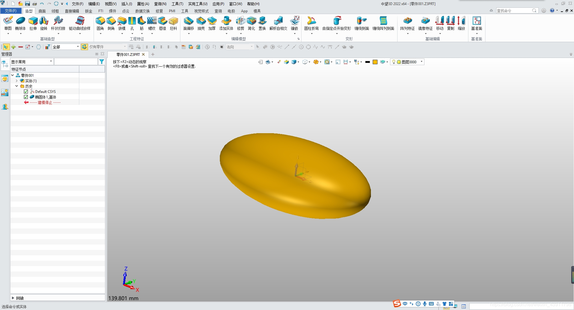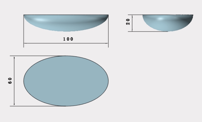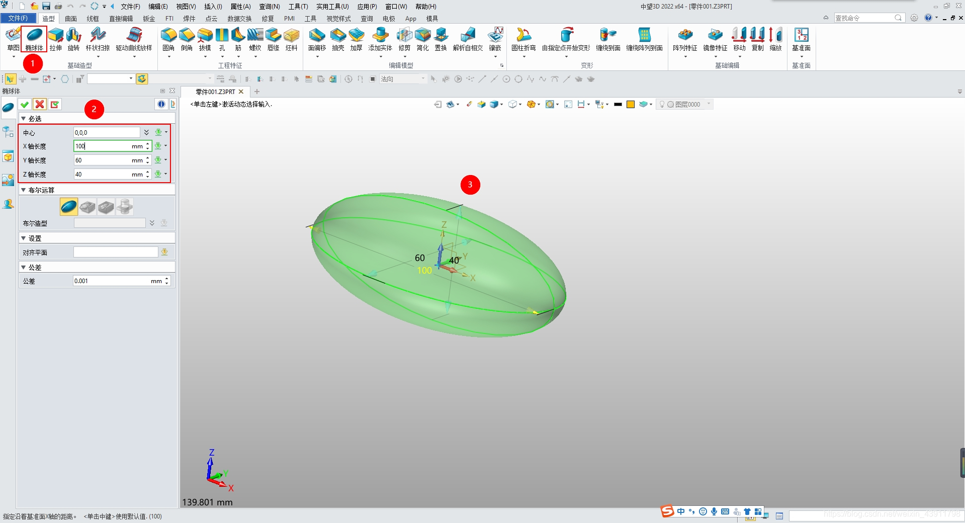 1.单击椭球体按钮,绘制椭球体,中心选择0,0,0,X轴长度设置为100,Y轴长度设置为60,Z轴长度设置为40,如下图所示。