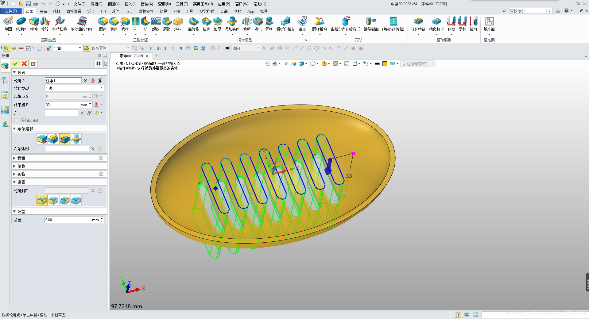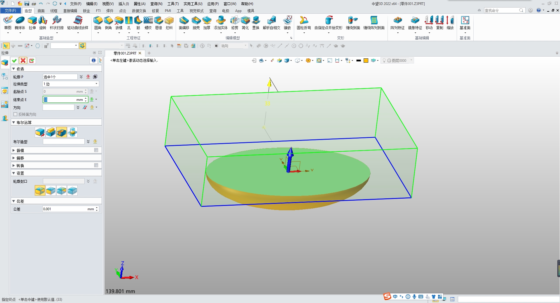 3.单击退出按钮,退出草图环境。单击拉伸按钮,选择上一步骤中所画的草图,如下图所示,此时,拉伸类型为1边,布尔运算选择减运算,向Z轴正方向拉伸切除,拉伸长度不限,大于需要切除的部分即可。