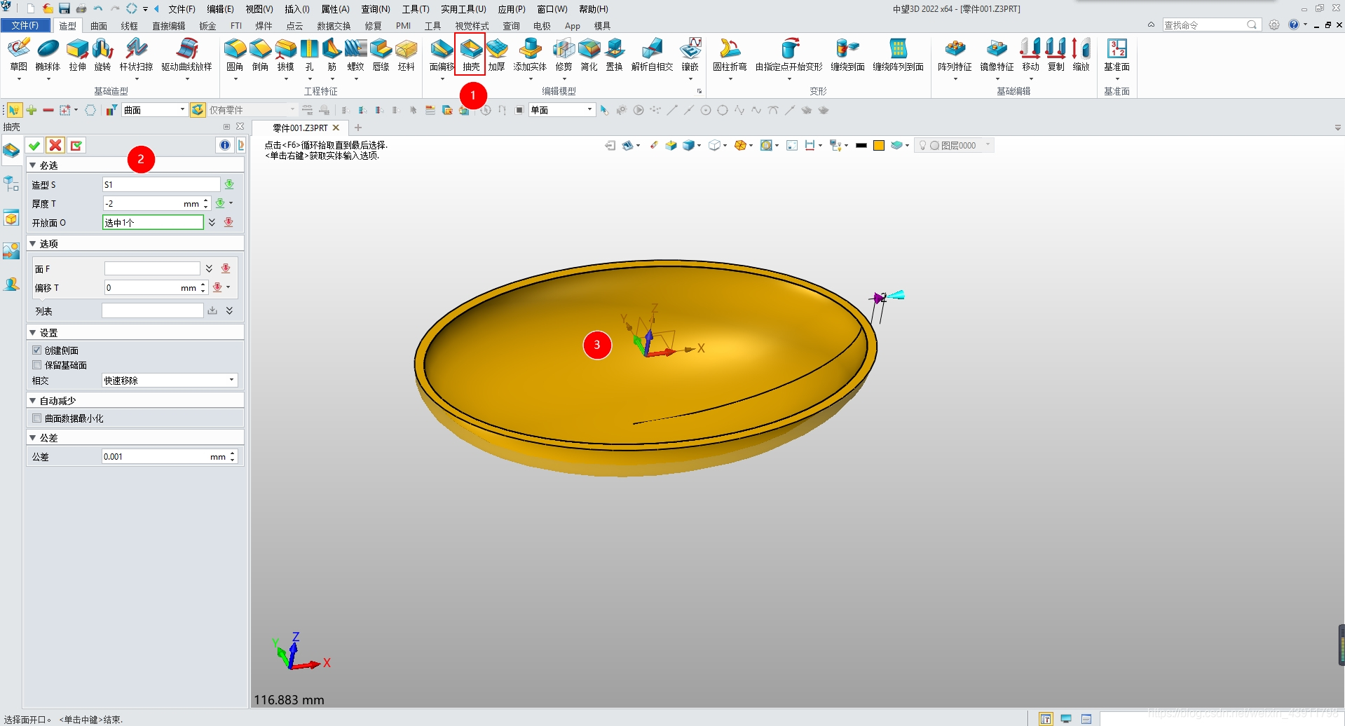 4.单击抽壳按钮,出现如下图所示的对话框,选择上一任务中所画的造型,厚度为“-2”,开放面选择如下图中所示的面。