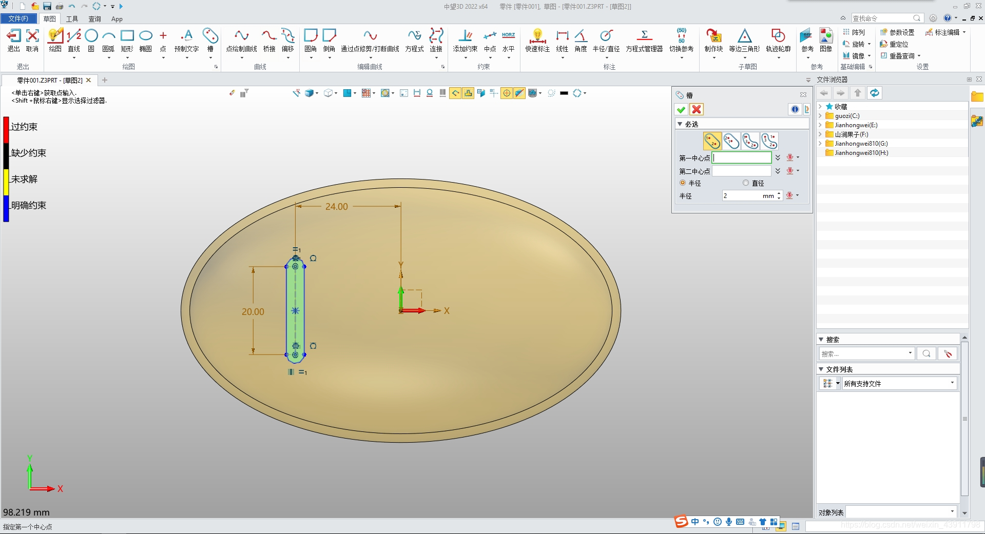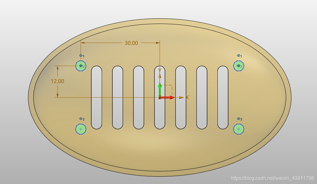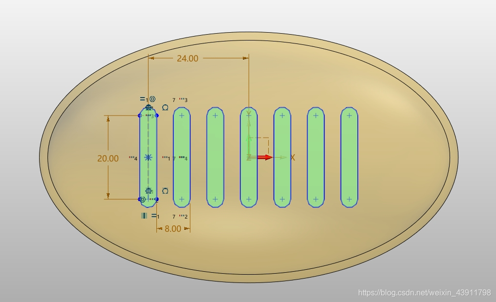 5.选择“XY”平面创建草图,进入草图界面。单击槽按钮,在任意位置绘制图形,直径设置为4,如下图所示。并约束其尺寸和位置,使其位置、尺寸正确,如下图所示。