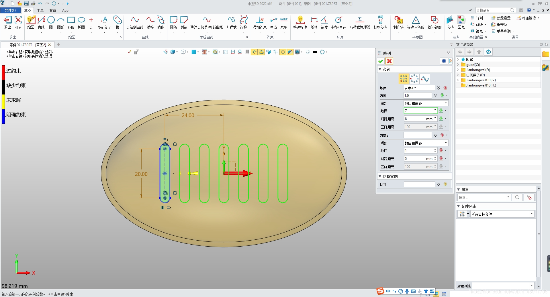 6.单击线性阵列,方向选择X轴正方向,数目为7,间距距离为8,如下图所示。