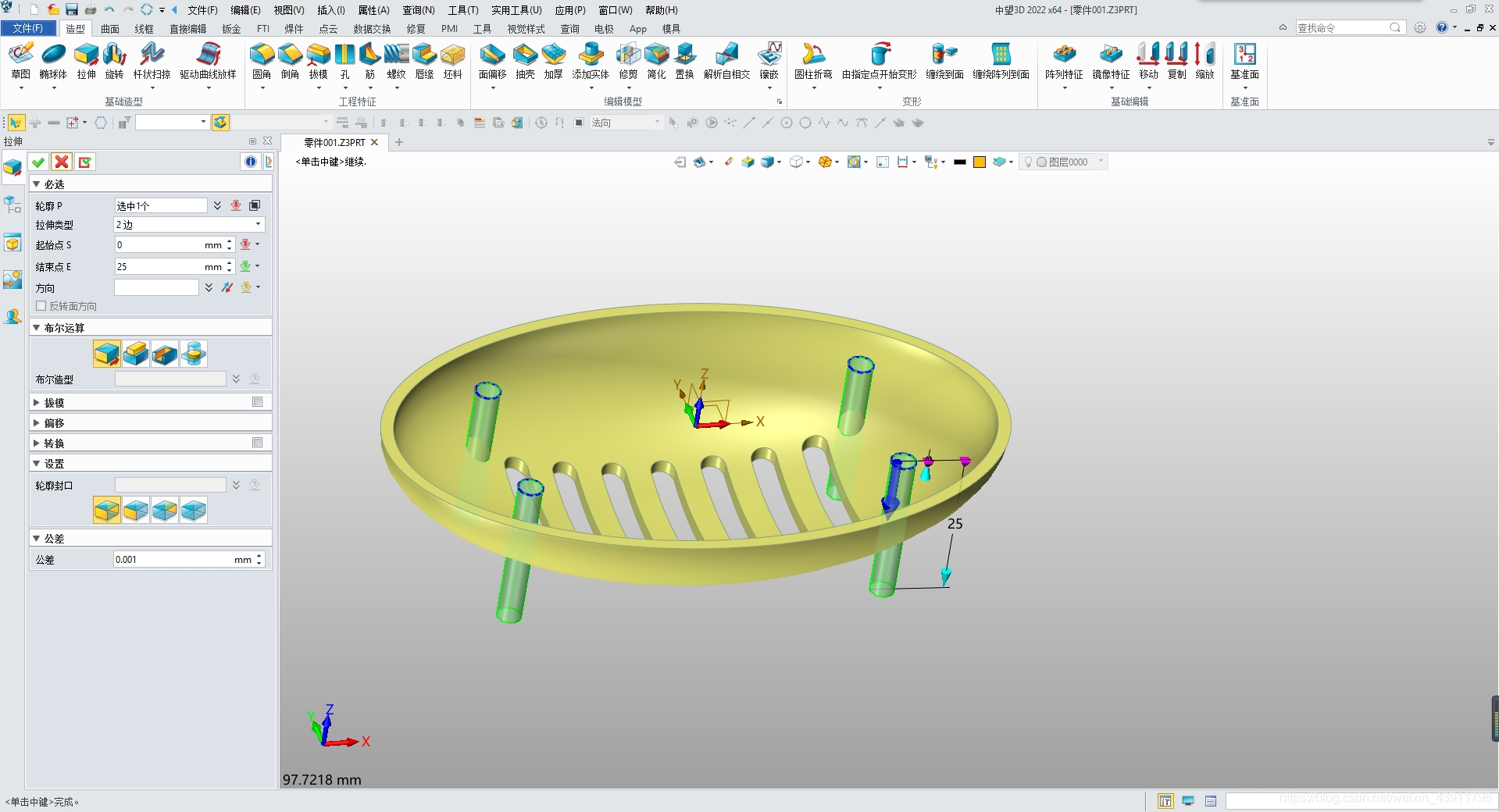 9.单击退出按钮退出草图,拉伸该草图,如下图所示,注意,此时不选择布尔运算,拉伸的结束点为-25。