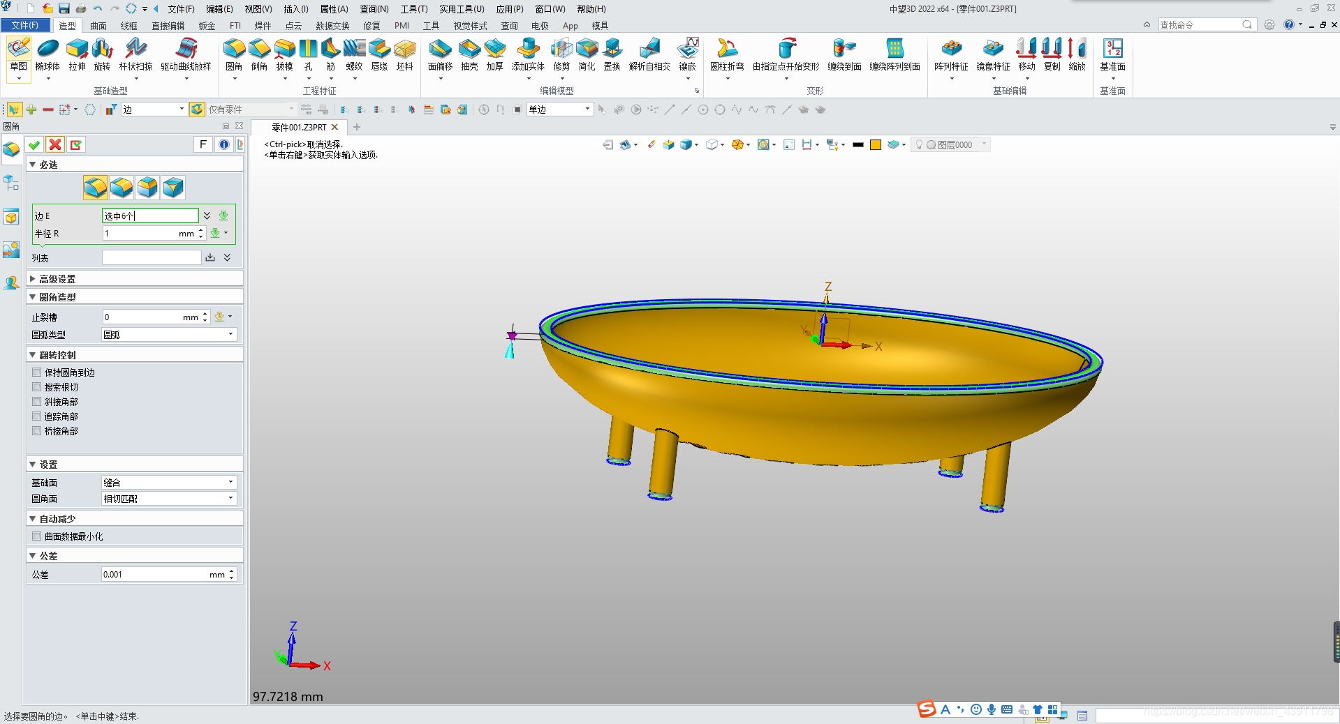 10.单击圆角按钮,设置半径为1,选择香皂盒的内边缘、外边缘以及脚的边缘进行倒圆角。