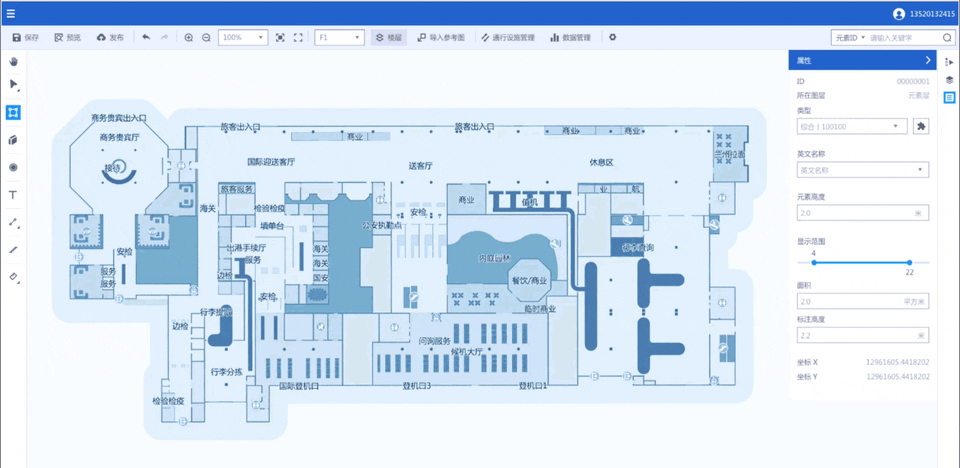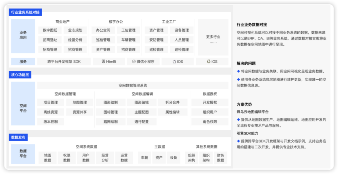 该空间数据平台的创新之处在于支持自动识别、快速转换和轻量化多源异构数据生成三维电子地图,包括CAD、JPG、纸质图片(多源)以及激光点云、航拍、倾斜摄影(异构),简便灵活的三维场景创建、配置和编辑、修改能力;丰富的二次开发接口(SDK&OpenAPI)和便捷的多维数据融合能力;室内外结合的精准定位和位置服务能力。