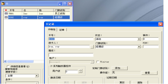 在卡和持卡人界面,我们可以配置卡、持卡人、选择门禁级别等。