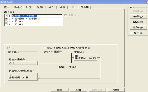 注:一般读卡器1对应的电锁为“出1”,自由外出为“入1”,状态输入为“入2”;