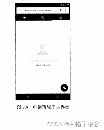 由于我们之前一直使用的都是模拟器,电话簿里面并没有联系人存在,所以现在需要自己手 动添加几个,以便稍后进行读取。打开电话簿程序,界面如图7.9所示。