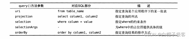 Cursor cursor = getContentResolver().query(uri,projection,selection,selectionArgs, sortOrder); 这些参数和SQLiteDatabase中query ()方法里的参数很像,但总体来说要简单一些,毕竟这 是在访问其他程序中的数据,没必要构建过于复杂的查询语句。下表对使用到的这部分参数进行 了详细的解释。