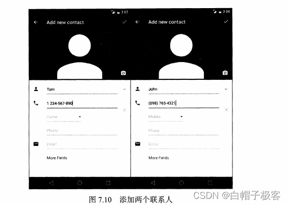 可以看到,目前电话簿里是没有任何联系人的,我们可以通过点击ADD A CONTACT按钮 来对联系人进行创建。这里就先创建两个联系人吧,分别填入他们的姓名和手机号,如图7.10 所示。