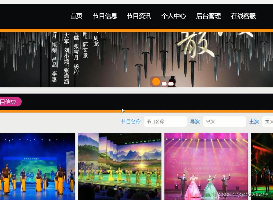 前台用户可以先进行注册,填写个人的基本信息提交到服务器,服务器把数据保存到数据库。管理员对会员的信息进行验证后,会员通过验证后的用户名和密码进行登录,登录之后查看剧院节目,包括戏剧、戏曲、歌舞、舞蹈、音乐、曲艺、杂技、马戏等。剧院节目在首页展示,查看剧院节目具体信息后,可以进行预订,填写预订信息后,生成节目订单。点开我的功能模块,修改个人信息,重新登录等功能。