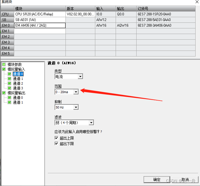 二、程序编写,em06的模拟量编号aiw16、18、20、22