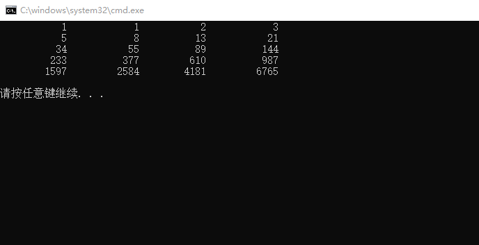 #includeint main(){//等同于{1,1,0,0,0,0,0,0,0,0,0,0,0,0,0,0,0,0,0,0}int f [ 20 ] = { 1,1 };for ( int i = 2; i < 20; i++ )//计算f[2]-f[19]的值f [ i ] = f [ i - 2 ] + f [ i - 1 ];for ( int i = 0; i < 20; i++ ){//控制每行输出4个数后换行if ( i%4==0 ){printf( "\n" );}printf( "%12d", f [ i ] );}printf( "\n" );return 0;