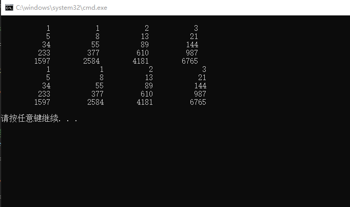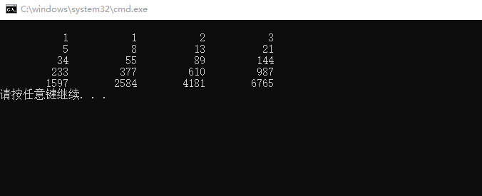 int main() {//用数组来处理斐波那契数列问题//等同于{1,1,0,0,0,0,0,0,0,0,0,0,0,0,0,0,0,0,0,0}int f [ 20 ] = { 1,1 };for ( int i = 2; i < 20; i++ )//计算f[2]-f[19]的值f [ i ] = f [ i - 2 ] + f [ i - 1 ];for ( int i = 0; i < 20; i++ ){//控制每行输出4个数后换行if ( i%4==0 ){printf( "\n" );}printf( "%12d", f [ i ] );}printf( "\n" );//用循环来处理斐波那契数列问题int f1 = 1, f2 = 1;for ( int i = 1; i <=10; i++ ){printf( "%12d %12d", f1, f2 );if (i%2==0 ) {printf( "\n" );}f1 = f1 + f2;f2 = f2 + f1;}printf( "\n" );return 0;