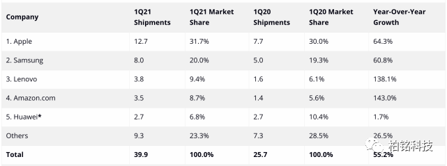 市调机构IDC公布了今年一季度全球平板电脑市场排名数据,数据显示全球平安电脑市场前五名当中除华为之外均取得大幅增长,其中中国平板电脑品牌联想的出货量更是倍增并重夺全球平板电脑市场第三名。