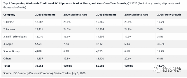 华为不仅在平板电脑市场与联想是竞争对手,在PC市场也与联想是竞争对手。2020年上半年的数据显示,华为在国内平板电脑市场取得近17%的市场份额,仅次于联想,国内市场是联想的大市场。2020年Q2全球PC市场的数据显示,惠普、联想的出货量同比增速分别为17.7%、7.4%,市场份额分别为25%、24.1%,联想以微弱劣势败给惠普,当中就难言没有华为抢占PC市场给联想造成的负面影响。