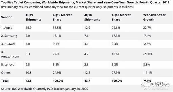 在全球平板电脑市场,这几年上涨迅速的无疑是华为,由于华为平板电脑的出货量快速增长,三星、联想、亚马逊的出货量均持续下滑,其中联想更是一度跌落至全球平板电脑市场第五名(2019年Q4联想平板电脑仅位居第五名)。