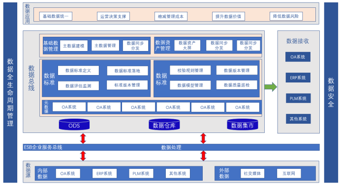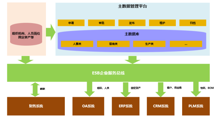 如数据架构图所示,是从数据源头系统获取组织、人员、岗位、客户、供应商等基础数据信息,通过ESB企业服务总线将数据同步至MDM主数据管理平台中,在主数据管理平台进行数据模型的创建、数据编码的定制以及数据质量的管理等等,最后将干净的数据分发至需要的各业务系统中。