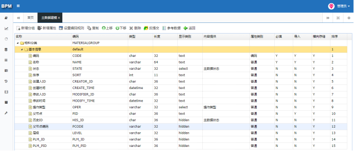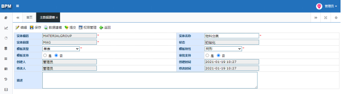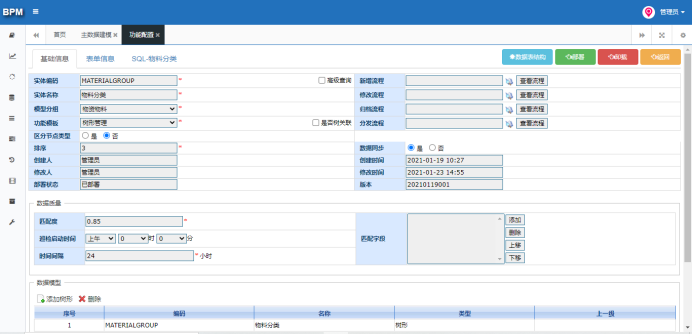 根据元数据及参考数据调研结果在MDM主数据管理平台创建数据模型,数据模型分为数据建模、功能建模以及流程建模。在数据建模创建物料分组主数据。
