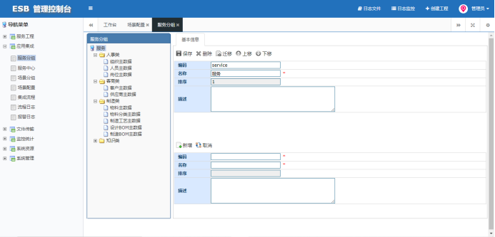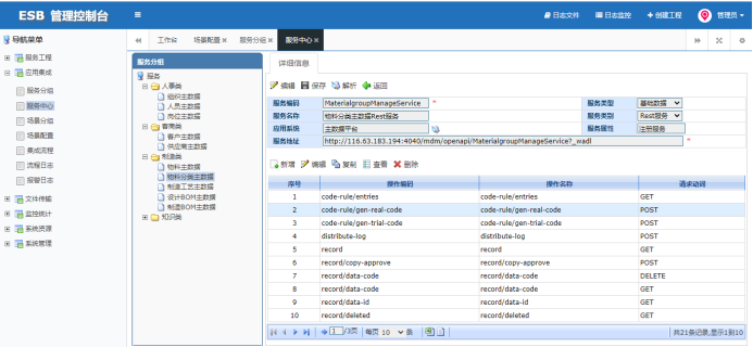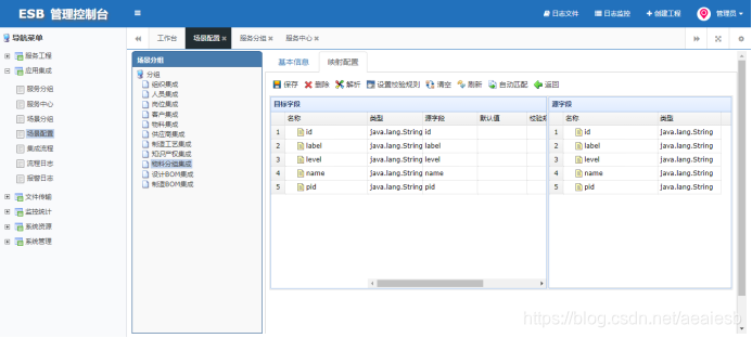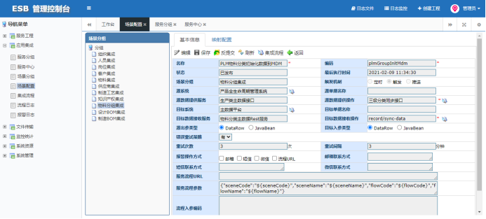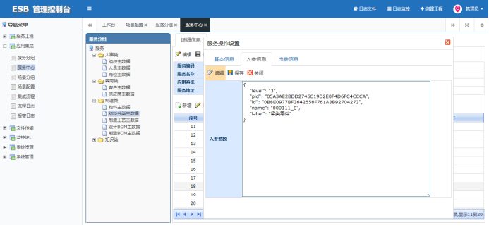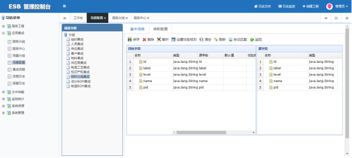 ESB企业服务总线应用集成部分首先需要将各个业务系统提供的服务在ESB企业服务总线注册,之后配置接口的入参及出参信息,在场景配置模块进行对接,定义触发机制及预警机制等。