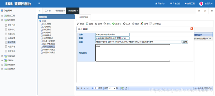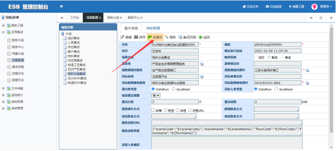 效果展示以数据初始化为例,在ESB企业服务总线,调用物料分组同步应用集成流程。